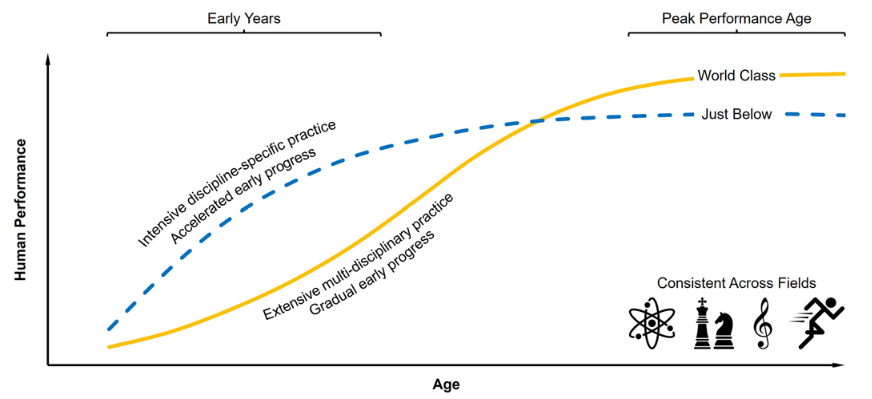 “The development of the highest levels of human achievement. Across domains, world-class performers, compared with peers performing just below this level, engaged in more multidisciplinary practice and showed more gradual performance progress through their early years.”